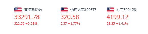 美国三大股指全线收涨,道指涨0.98%报33291.78点,标普500指数涨1.41%报4199.12点,纳指涨1.67%报12639.27点。波音涨3.6%,英特尔涨3.04%,领涨道指。