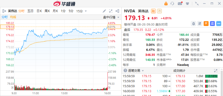 英伟达于周三盘后发布其Q2最新财报,因营收、净利表现不佳且Q3指引不如意,周四盘前一度跌超4%。不过英伟达在周四低开后连续拉升,收盘上涨4.01%,强势逆转局面。