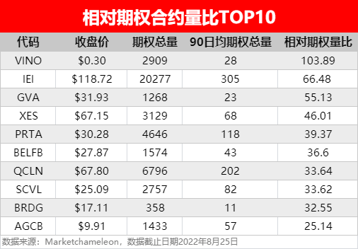 注:相对成交量比,是指当前交易日期权成交数量与90日平均期权成交数量的比值,相对成交量比越高,意味着该期权标的近期活跃度越高,不同于期权成交总量,该量比指标可以帮助发现一些期权成交数量绝对值不高,但是近期成交数量显著上升的期权标的。