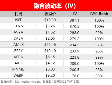 重点动态:临床阶段生物制药公司Clene $CLNN 、生物制药公司IVERIC $ISEE 及WSB概念股及3B家居 $BBBY 隐含波动率持续位于高位。据报道,3B家居与资产管理公司Sixth Street Partners接近达成4亿美元贷款协议。该公司预计将于下周三公布回归策略,以求业绩扭亏为盈。