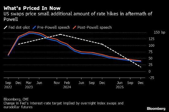 与美联储9月会期挂钩的利率期货合约定价为升息63个基点,相当于是说9月份加息50或75基点的概率各占一半。鲍威尔讲话之前, 9月互换合约的定价为59个基点。市场预计今年年内还将升息1.32个百分点,高于之前预测的1.29个百分点。