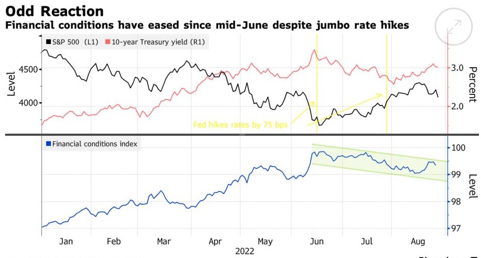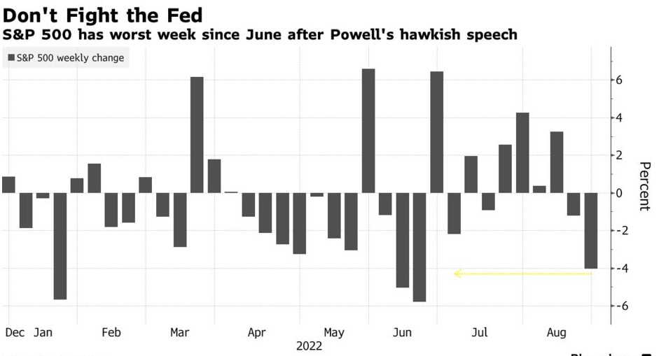 标普500指数本周下跌4%,为熊市触底以来最糟糕的一周。几乎所有的下跌都发生在周五,在一场十分钟的政策谈话之后,原本无精打采的夏季一周变得火热,鲍威尔在谈话中直接针对市场乐观情绪。