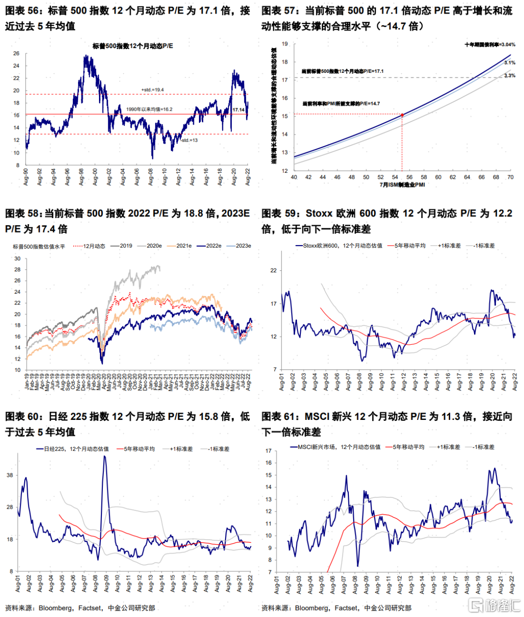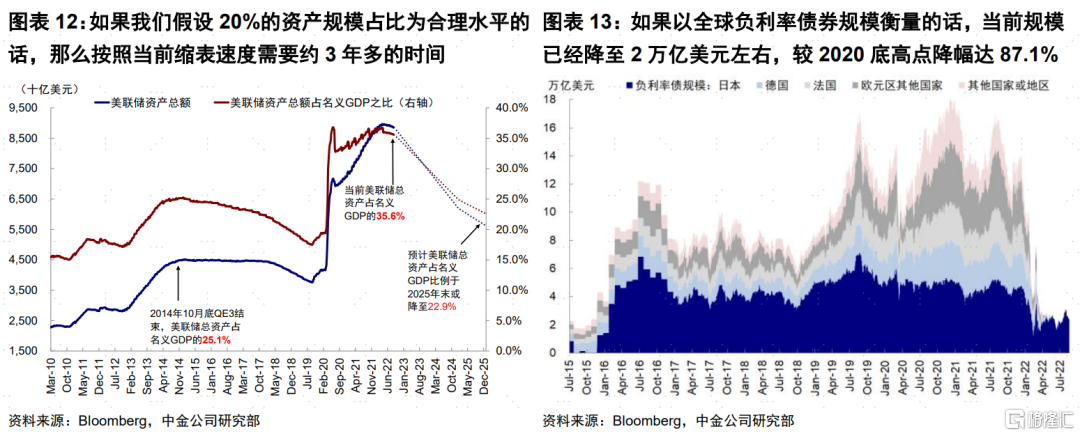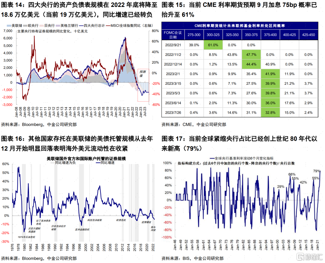 当前美联储资产负债表规模仍然较高距离正常化“任重而道远”。美联储理事Waller曾于2021年12月表示希望将美联储资产占GDP比例降至20%左右、即疫情前水平(当前美联储资产规模占GDP仍高达35%)。如果我们假设20%的资产规模占比为合理水平,那么按照当前每月950亿美元的缩表速度需要约3年多的时间,即持续到2025年末。与此同时,在高通胀的压力下,全球的“紧缩竞赛”仍在继续,短期也难以看到明显逆转,这都会导致全球“便宜钱”继续减少(如果以全球负利率债券规模衡量的话,当前规模已经降至2万亿美元左右,较2020底18万亿美元的高点降幅达87.1%)。我们测算,按照当前全球主要央行给出的缩表路径,美欧日英四大央行的资产负债表规模在2022年底将降至18.6万亿美元(当前19万亿美元),同比增速已经转负(-1.3%),同比增速的拐点可能要到2023年初才能看到。