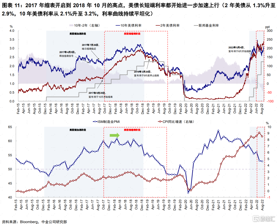 ►初期影响小于更激进的加息:年内缩表规模相当于不到50bp的加息。另一个导致缩表没有存在感的原因是此次加息更为激进,动辄50~75bp的单次加息使得同期缩表规模“相形见绌”。我们测算,年内4419亿美元的整体缩表规模(6~8月实际缩表619亿美元、9~12月每月950亿上限)仅相当于不到50bp的加息(缩减规模相当于GDP的1.8%)。参考2017年缩表经验,美联储在2017年10月开启缩表前共加息4次(每次25bp),同期银行准备金减少3229亿美元,相当于每25bp加息对应807亿美元银行准备金减少。2017年10月缩表开始到2018年12月最后一次加息期间准备金累计减少5515亿美元,相当于6.8次加息,扣掉实际加息5次(每次25bp),缩表3638亿美元大体相当于1.8次加息。如果粗略按照这一经验值测算,年内4419亿美元的缩表规模仅相当于50bp的加息。如果再考虑当前依然高达2万亿美元的逆回购规模,缩表造成的实际影响可能更小。