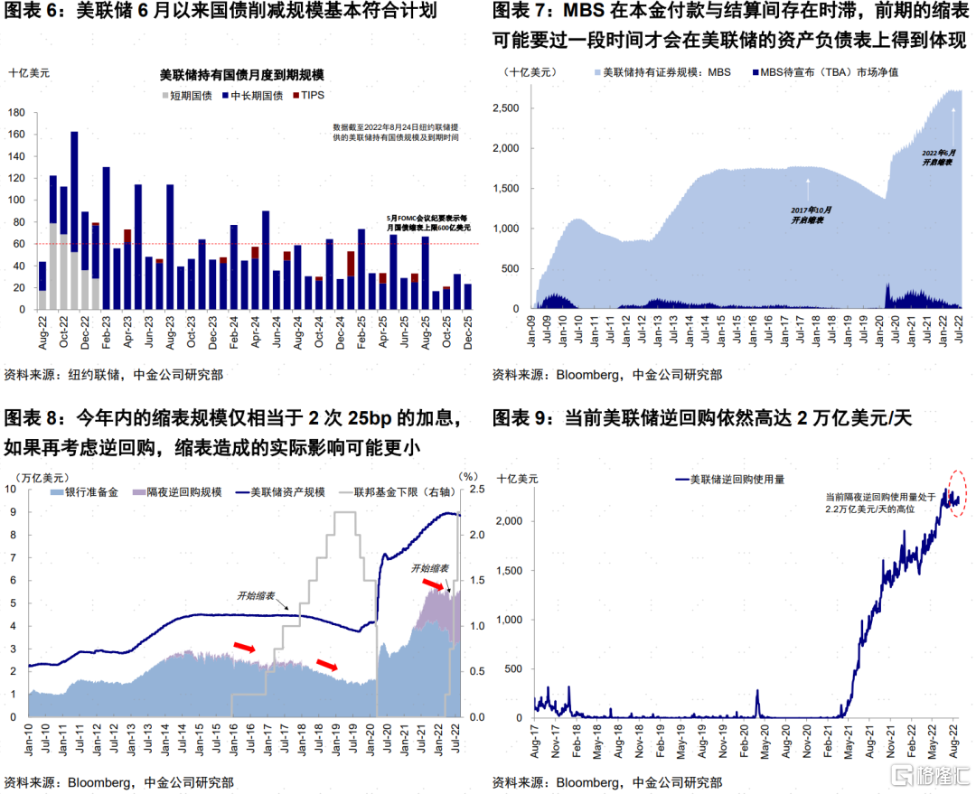 初期缩减规模很有限:到目前累计缩减规模仅为619亿美元,不仅慢于预期,相比整体超过8.3万亿的持有证券规模也非常微小。初期影响小于更激进的加息,年内缩表规模相当于不到50bp的加息。