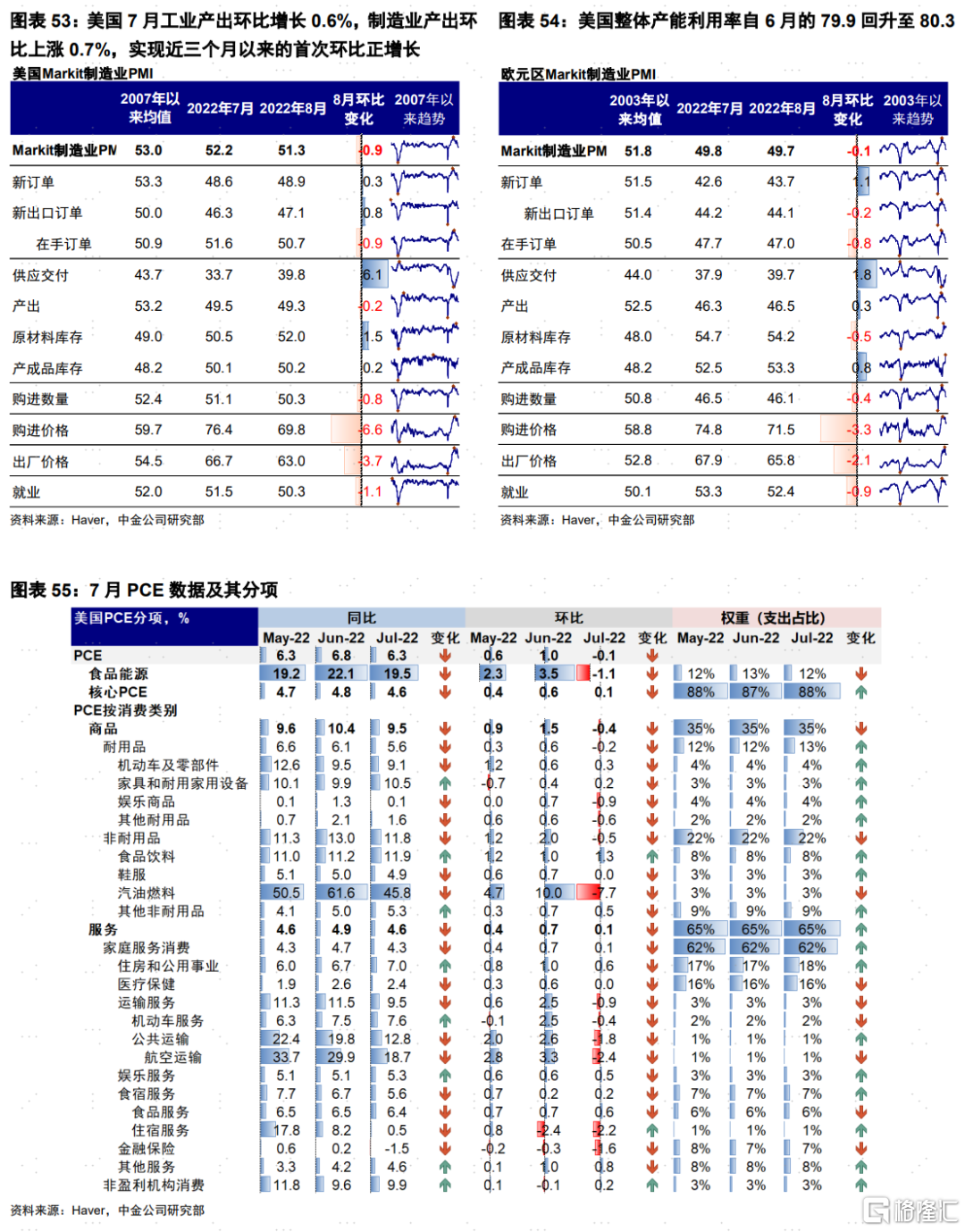 PCE及核心PCE增幅放缓、环比下跌。美国7月PCE同比增长6.3%(vs. 6月6.8%),环比回落0.1%(vs. 6月1%);核心PCE同比增长4.6%(vs. 6月4.8%),环比增长0.1%(vs. 6月0.6%)。商品项中,汽油燃料支出伴随油价下跌环比回落7.7%;服务项中,运输服务(机动车运输、公共运输、航空运输等)也受油价影响环比回落明显,住宿服务环比也有所回落。
