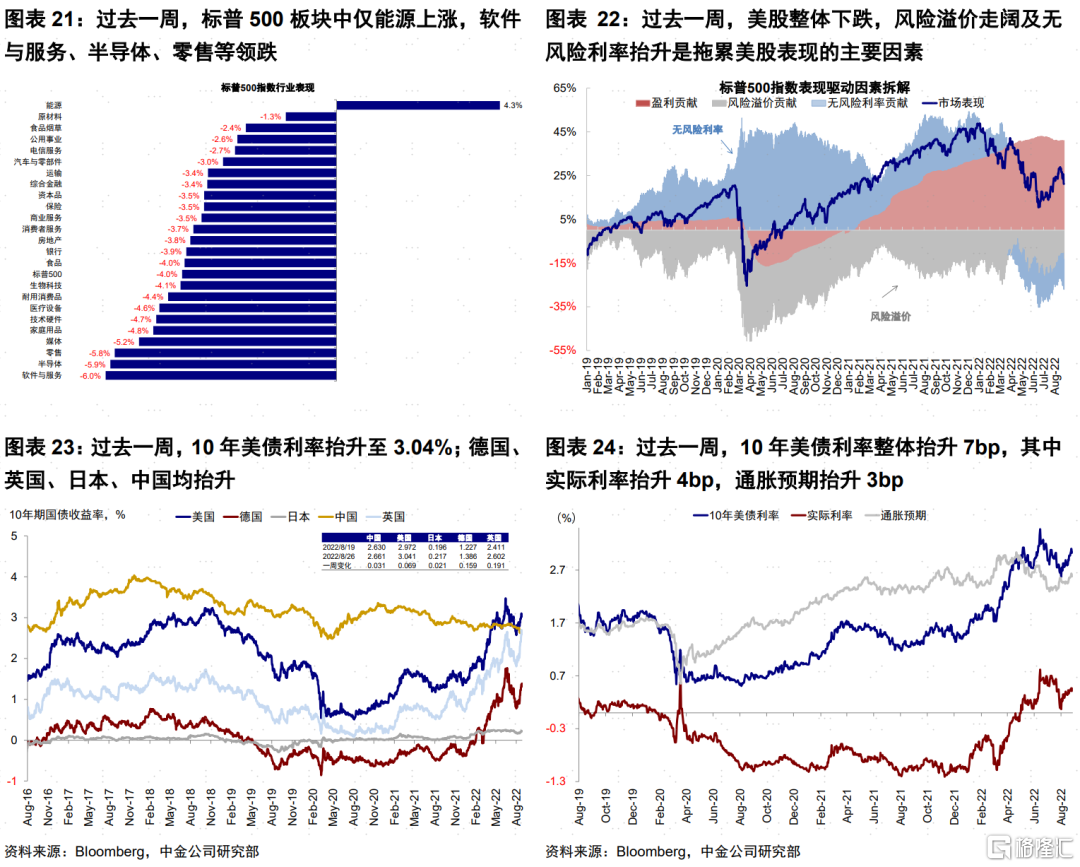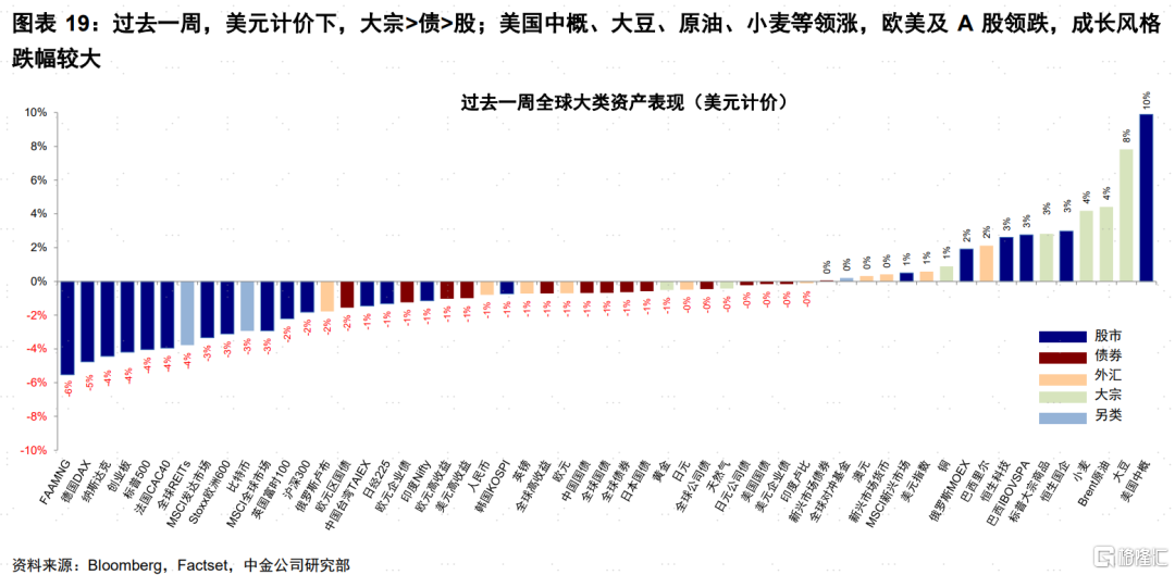政策鹰派预期仍为本周市场情绪的主导,周五鲍威尔在Jackson Hole年会发言比市场预期的更为鹰派,致使美债利率及美元指数本周整体收高。美股在本周利率抬升的背景下整体下跌,尤其是周五大幅回调,以FAAMNG为代表的成长股跌幅明显,而美国中概股则在中美签署审计监管合作协议的影响下收涨。大宗商品方面,受近期高温干旱天气影响,大豆等农产品涨幅领先。