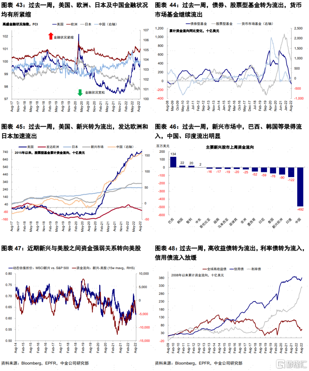 过去一周,债券、股票型基金转为流出,货币市场基金继续流出。分市场看,美国、新兴转为流出,发达欧洲和日本加速流出;新兴市场中,巴西、韩国等录得流入,中国、印度流出明显。