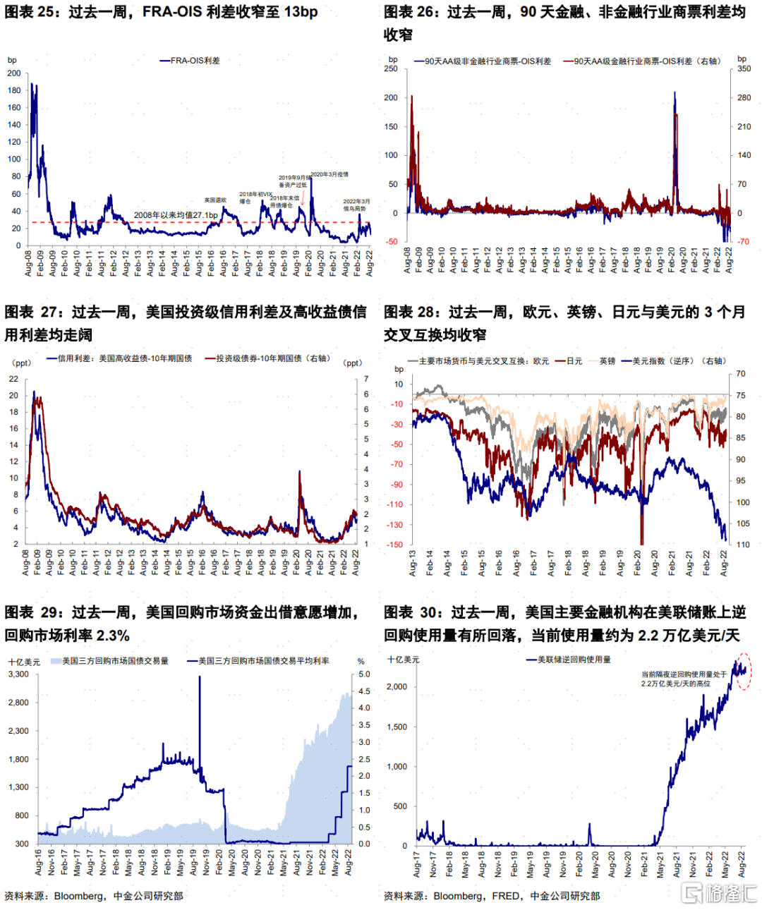 过去一周,FRA-OIS利差收窄至13bp,投资级及高收益债信用利差均走阔。90天金融、非金融行业商票利差均收窄,欧元、英镑、日元与美元的3个月交叉互换均收窄。美国主要金融机构在美联储账上逆回购使用量有所回落,当前使用量约为2.2万亿美元/天。