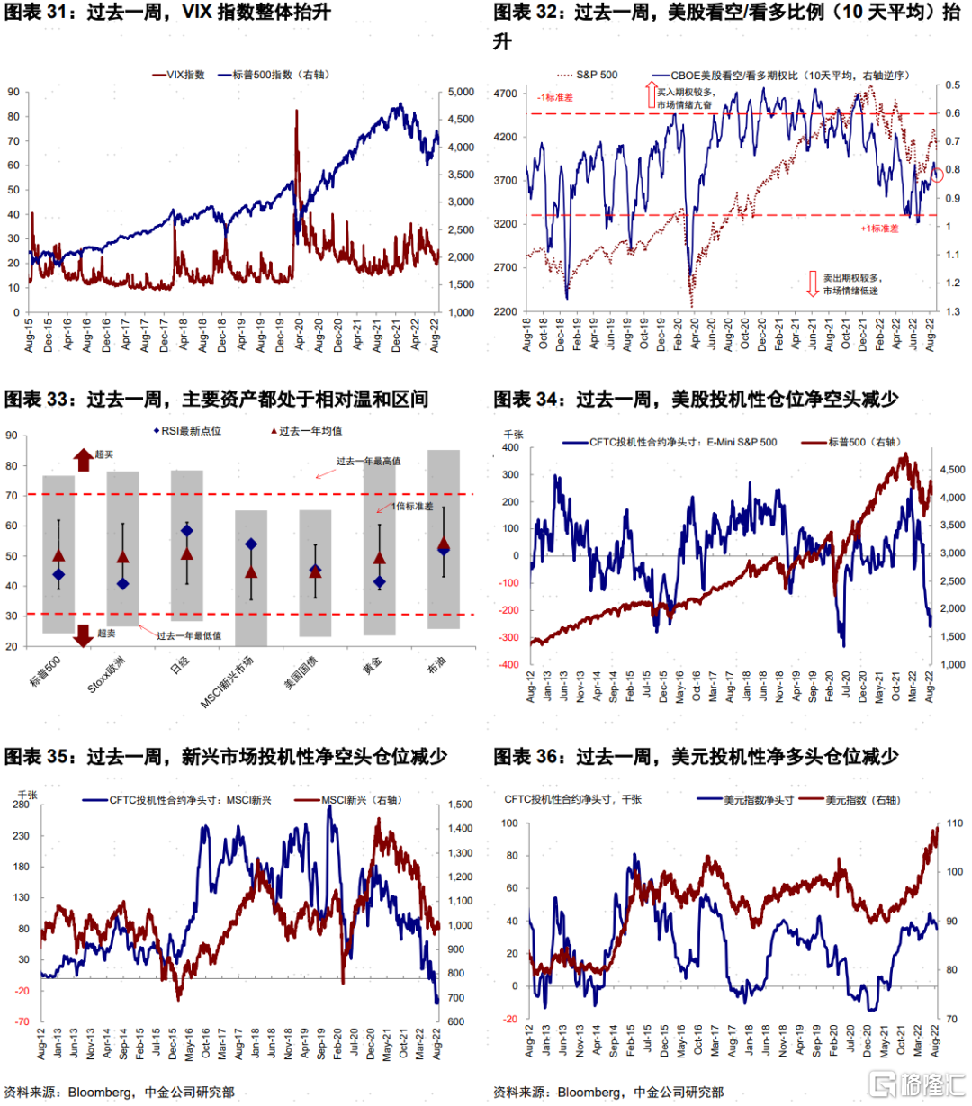 过去一周,美股看空/看多比例(10天平均)抬升。仓位方面,美股、新兴市场投机性仓位净空头减少,黄金投机性净多头仓位减少,银期货投机性仓位转为净空头,10年及2年美债净空头仓位均增加。