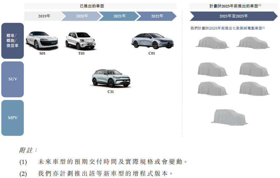 该公司于2021年10月开始交付中型智能纯电动SUV C11。 于2022年5月,公司推出一款智能纯电动中大型轿车C01。