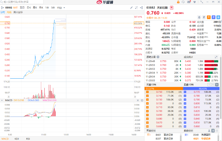 华盛资讯8月29日消息,天彩控股绩前抢跑,早盘大幅走高升462.96%,成交量暂创4年半以来新高。公司拟于今日盘后发布中期业绩。截至发稿,天彩控股报0.76港元每股,成交额0.11亿港元,市值为7.24亿港元。
