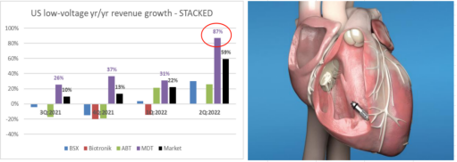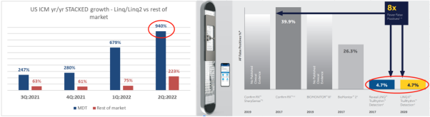 美敦力的心脏监护仪器(ICM)也是近乎垄断性的存在:在2022年第二季度的市场份额累积增速高出市场四倍以上的同时,市场份额环比和同比均大幅上升,分别高达67% 和 69%。而支撑这部分业绩的是旗下核心产品Linq2,该产品是一种小型(AAA三分之一体积)无线心脏监护仪,适用于心律异常的患者。