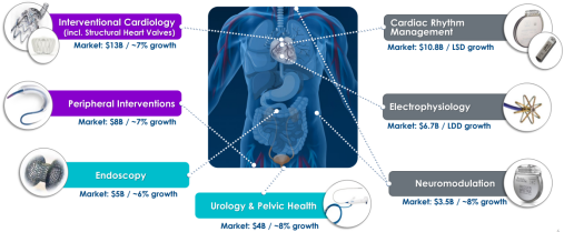 和美敦力相比,波士顿科学没有手术机器人以及MRI等大型设备,而主要集中在心血管和外科(Medsurg) 的微创介入耗材。心血管部门约占总收入的 40%,包括外周/主动脉支架和起搏/除颤器。外科收入约占60%左右,包括内窥镜,泌尿科导管和用于神经调节的电生理设备。