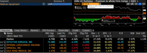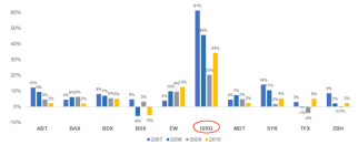 同时,笔者认为ISRG相对其他器械公司有更强的抗经济衰退(recession)属性:回看上一次经济衰退期间(2007-2010),ISRG也是在行业整体衰退萎靡的时候保持着远超行业的增速(见下图)。是因为ISRG相对同业承受更少逆风吗?并不是。比如这次供应链危机中,公司的芯片和树脂的供应链断裂使得其相对同业承受更多的损失。