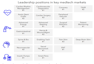 美敦力是全球最大的医疗器械制造商之一,产品管线覆盖几乎所有临床条件需要的器材:大到手术机器人,MRI;小到心脏支架和微型起搏器;与其竞争对手不同,美敦力并没有过度依赖任何一种特定的产品、设备或治疗类型。美敦力的收入由四部分构成:心血管(36%),神经科学(29%),手术机械(28%)和糖尿病(7%)。尽管业务分部平均,但公司其实在每个子行业都属于行业龙头(见下图),市场份额基本上不是第一就是第二。而美敦力的成功,来自于稳定的系统,以保证产品的迭代升级。