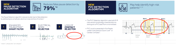 Linq2相对一代产品最大的改变就是加入了暂停检测算法和PVC 检测算法。前者通过算法识别低幅度、电噪声和失去接触的问题,从而将之前前代相关产品检测错误率80%。后者通过使用R-R 间隔和形态特征算法来区分 PVC 心跳和正常心跳,从而快速识别高危患者。