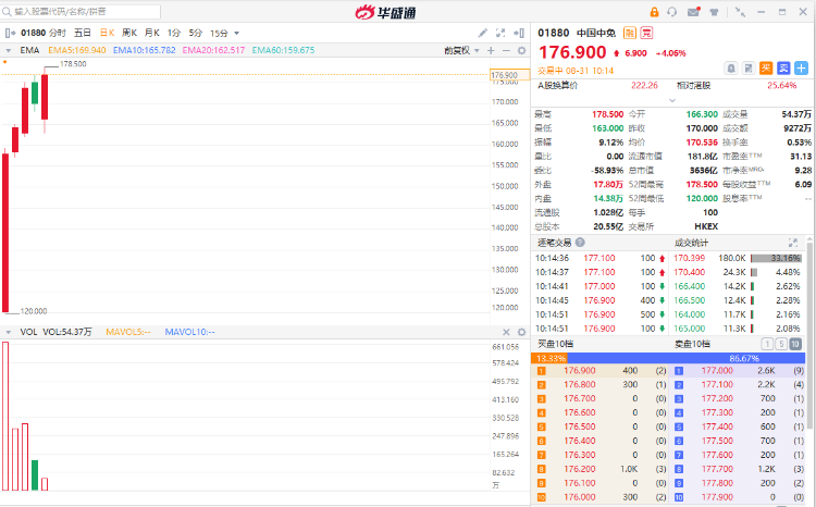 华盛资讯8月31日消息,中国中免 $01880.HK 港股低开高走,股价高见178.5港元续刷新高。截至发稿涨4.06%,报176.9港元每股,成交额9272万港元;早盘股价一度跌逾3%。