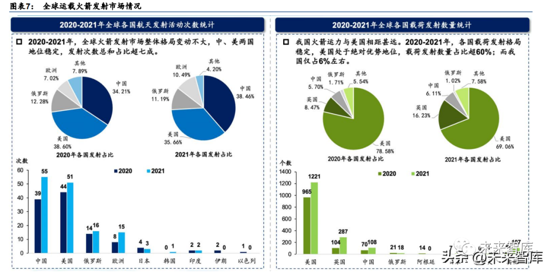 纵观全局,我们认为运载能力不足是我国运载火箭现阶段的主要痛点。从全局看运载火箭 发射市场,2020-2021 年全球各国火箭发射活动次数整体格局变动不大,中、美两国地位 稳定,总和占比超七成。然而火箭运力方面,我国与美国相距甚远。2020-2021 年全球各 国载荷发射格局稳定,美国处于绝对优势地位,载荷发射数量占比超 60%;而我国位列第 三,载荷发射数量仅占全球发射总数量的约 6%。因此,在与美国发射次数基本相同的情 况下,载荷发射数量的差距反映了我国火箭运载能力方面的薄弱。