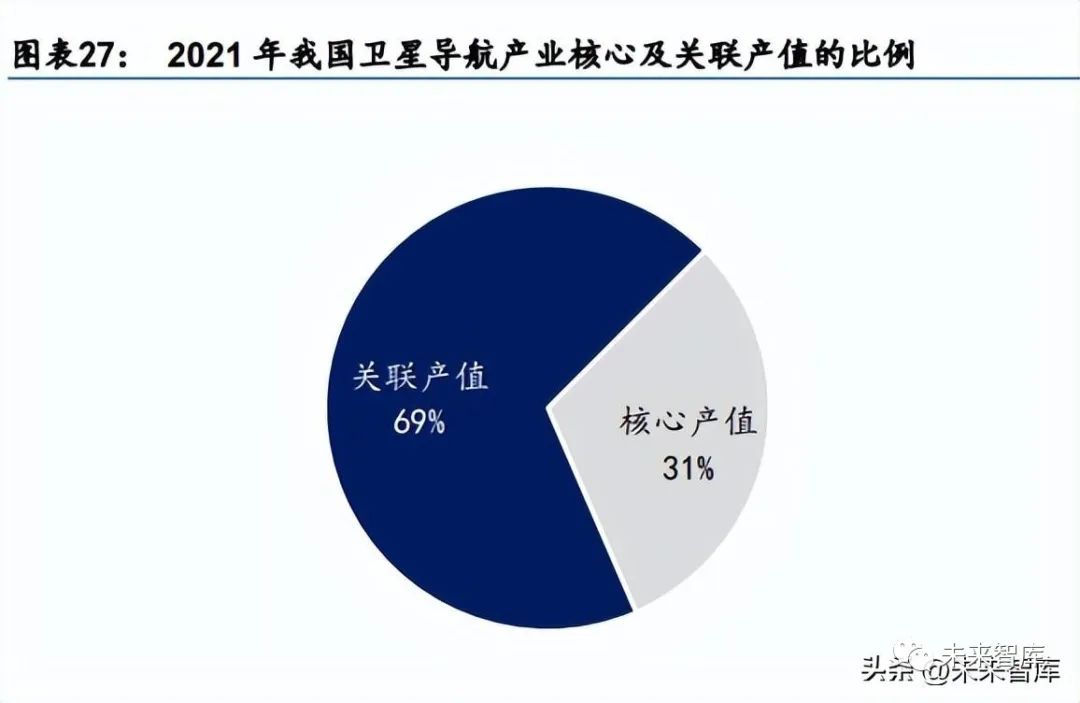 北三有望加快关联产值的增速,“北斗+”与“+北斗”的产业融合生态或成新增量。根 据《2022 中国卫星导航与位置服务产业发展白皮书》,2021 年我国卫星导航与位置服务产 业总体产值中,由卫星导航应用和服务所衍生带动形成的关联产值同比增长约 18.20%, 达到 3236 亿元人民币,在总体产值中占比达到 69%。截至 2020 年末,我国卫星导航与 位置服务产业的核心产值与关联产值的比例为 1:2.11,2021 年比例为 1:2.23,结合国外 相关研究机构的分析预测,当前全球 GNSS 产业的核心产值与关联产值平均比例超过 1:3, 相较全球情况而言,我国卫星导航与位置服务市场发展对其他领域的衍生带动效益还有较 大的提升空间。随着“北斗+”融合创新和“+北斗”时空应用的不断发展,北斗越来越 多的与其他技术及应用实现融合创新,新兴应用场景涌现,带动行业和大众应用衍生价值 不断提升。未来,北斗/GNSS 与 5G、云计算、区块链等技术的融合创新必将极大赋能传 统行业领域,我国卫星导航与位置服务产业的发展重点将持续转向与各类产业的融合发展, 发挥卫星导航与位置服务产业对于传统产业改造和整合的强大作用,扩大增量空间。根据 《国家卫星导航产业中长期发展规划》,北斗导航市场规模将占到卫星导航产业市场规模 的 60%,预计 2027 年我国卫星导航与位置服务产业市场规模将达 17000 亿元左右。