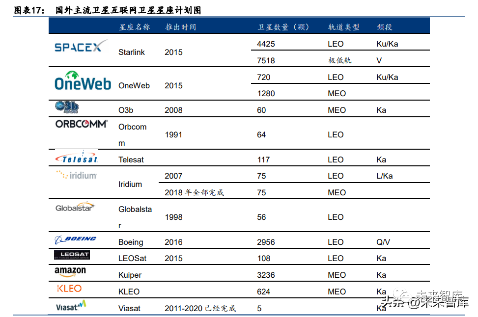 Starlink 星座建设步伐领先全球,目前已公布星座计划的国外公司中,美国 SpaceX 提出 的 Starlink 规模最大,计划最终将建成 4.2 万颗卫星组成的低轨互联网巨型星座,而其他 公司的星座规模从几百颗到数千颗卫星不等。Starlink 星座分两个阶段建设:第一阶段计 划部署 1.2 万颗低轨卫星,第二阶段计划部署 3 万颗低轨卫星。Starlink 的第一代卫星需 要达到总共约 12,000 颗卫星才能提供全球服务,目前 SpaceX 已获准在低地球轨道(LEO) 部署 4408 颗卫星,使用 Ku 波段频谱将用户连接到其 Starlink 网络,其还拥有单独的 FCC 授权,可以发射 7,500 颗 V 波段卫星。此外,SpaceX 正向 FCC 申请要求批准增加 近 30,000 颗卫星以改善其宽带服务。截止到 2022 年 5 月 18 日,Starlink 已经发射了 2653 颗卫星,正常工作的有 2374 颗。