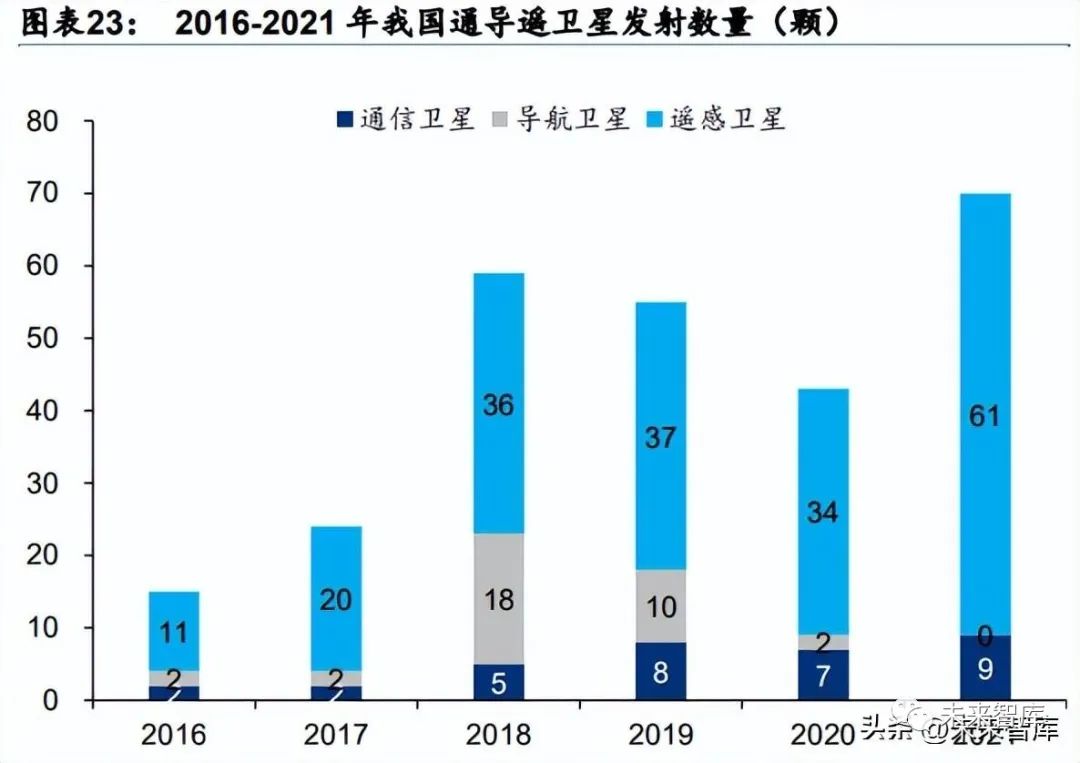长光卫星有望收获中国商业航天领域的第一个 IPO,短期内商业卫星制造集中在遥感卫星 成发展趋势。卫星按应用领域通常可分为通信卫星、导航卫星、遥感卫星(对地观测卫 星),从近五年的国内卫星发射数据来看,遥感卫星是三类卫星中我国发射最多,且占比 呈现增长趋势。2021 年,中国共发射航天器 117 个,其中遥感卫星 61 颗,仅次于美国 86 颗,占中国航天器研制发射总数的比例为 52.1%,占全球遥感卫星研制发射总数的 31.9%。对比 2020 年仅占全球遥感卫星发射总数的 23.3%,中国遥感卫星发射数量增速 明显且应用场景广泛,遥感卫星成国内卫星制造发展的核心驱动力,商业化的趋势显著。以国内第一家商业遥感卫星公司为例,长光卫星于今年 3 月进行首次公开发行股票并上市 公司辅导备案,有望收获中国商业航天领域的第一个 IPO。