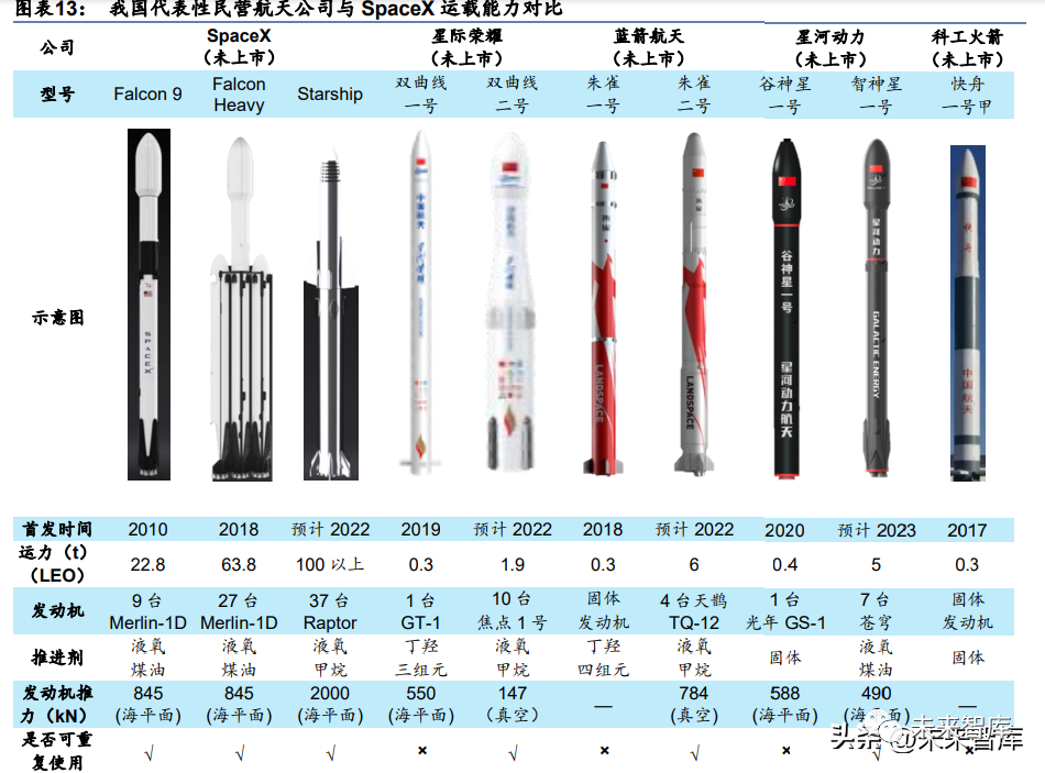 我们认为我国民营企业液体火箭发动机研制进程落后 SpaceX 13 年,在研发动机性能不 及“梅林”。SpaceX(未上市)目前拥有两款发动机,分别是液氧煤油发动机“梅林”和 液氧甲烷发动机“猛禽”,其中“梅林”发动机已成功复用数次,而我国液体火箭发动机 仍处在研制阶段且至少落后 SpaceX 13 年。代表性民营企业中,星河动力(未上市)在研 的发动机“苍穹”以液氧煤油作为推进剂,而蓝箭航天(未上市)和星际荣耀(未上市) 均计划研制液氧甲烷发动机。相比同样是液氧煤油的“梅林”发动机,“苍穹”的性能相 对较弱,推力、比冲和推重比均存在一定差距。此外,从整体上看,我国民营企业在研的 液氧甲烷发动机性能在各方面也都远不及“猛禽”发动机。
