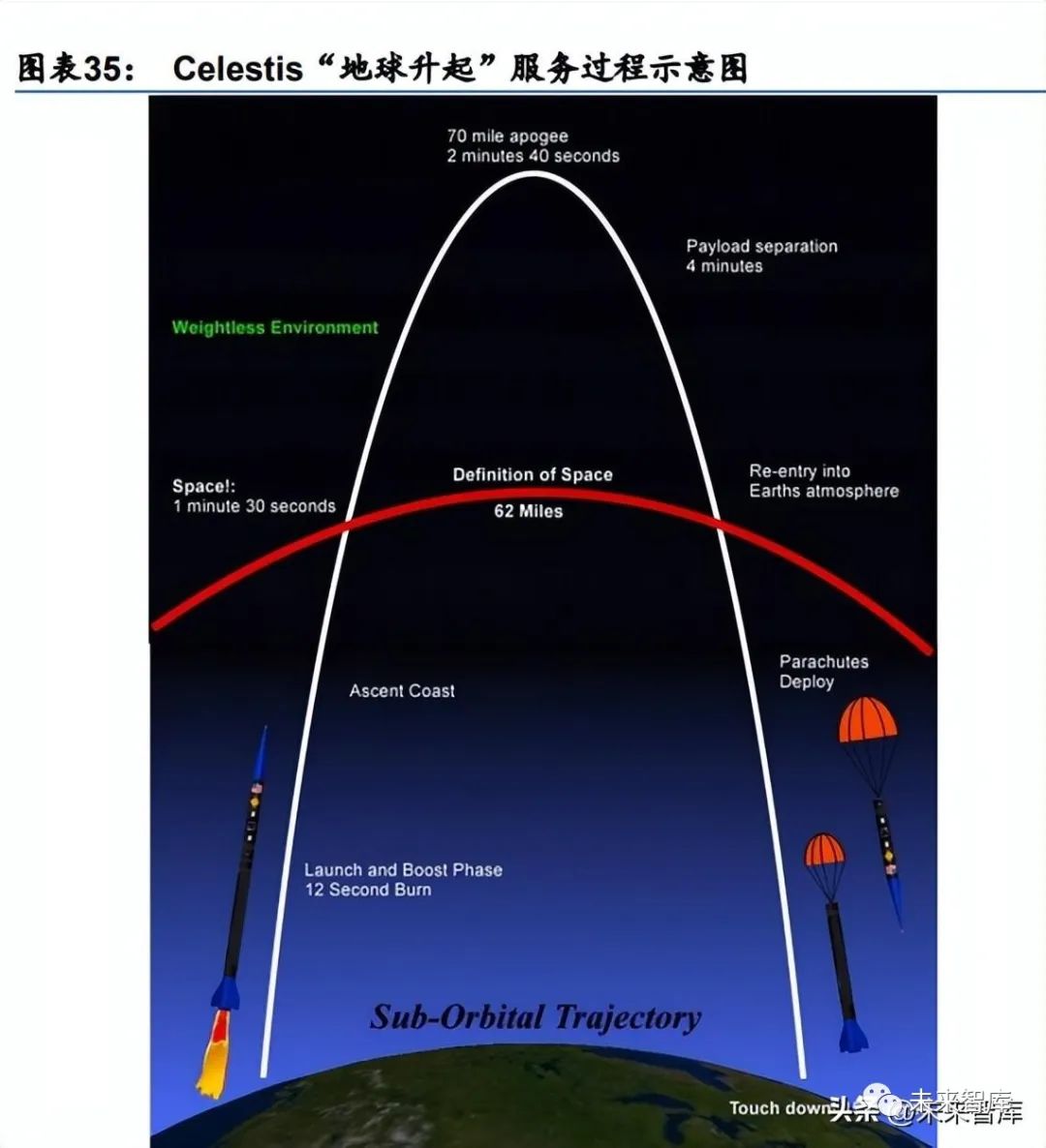 太空旅游是将人们送到太空中使人类可以去亲眼观赏太空风光、体会失重感觉的旅游活动, 其基于人类自古以来遨游太空的理想。太空旅游业务主要有 4 种,包括:太空边缘游、零 重力游、亚轨道太空旅游和轨道太空旅游。太空边缘游是指地球大气层与太空交界处的旅 游活动;零重力游是指利用飞机做抛物线飞行让游客体验约半分钟的太空失重感觉;亚轨 道太空旅游是利用载人飞船在火箭发动机熄火和再入大气层期间而产生几分钟的失重,其 是在 100km 高度以内进行的旅游活动;而轨道太空旅游是真正意义上的太空旅游,既包 含乘坐载人飞船在轨道上飞行,也包含到国际空间站上的旅游。2001 年,首位太空游客 美国丹尼斯·蒂托乘坐俄罗斯“联盟”TM32 号载人飞船到国际空间站上旅游观光了 9 天, 成为全球第一位太空游客。