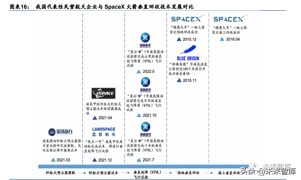 火箭垂直回收技术方面,我们认为相较于 SpaceX,我国至少落后 9 年。SpaceX(未上 市)于 2015 年、2016 年先后掌握运载火箭陆地垂直回收和海上垂直回收技术,2021 年 至今共成功回收火箭 52 次并创下同一运载火箭 13 次回收复用记录,远远领跑于世界。而 我国民营企业火箭垂直回收技术仍在探索阶段,2022 年 5 月深蓝航天(未上市)研发的 “星云-M”1 号试验箭完成了公里级垂直回收飞行试验,这是目前国内开展的飞行高度最高、 速度最快、时间最长的垂直回收飞行试验。下一阶段,深蓝航天(未上市)将采用与入轨 火箭相同的全尺寸试验箭进行 10km、100km 高空回收试验,并计划在 2024 年底前实现 中国可回收运载火箭的商业化运行。我国在火箭垂直回收技术方面整体发展加快,但和 SpaceX 仍存在较大差距,我国可回收运载火箭的研制将落后 SpaceX 至少 9 年。