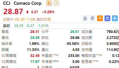 Cameco Corp $CCJ 涨超8%,公司是世界上最大的铀生产商之一,其位于Saskatchewan的旗舰矿McArthur River约占产出的50%。