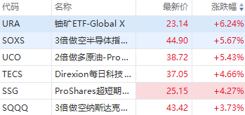 ETF方面,铀矿ETF-Global X $URA 涨超6%,3倍做空半导体指数 $SOXS 涨超5%,3倍做空纳斯达克指数ETF $SQQQ 涨超3%。
