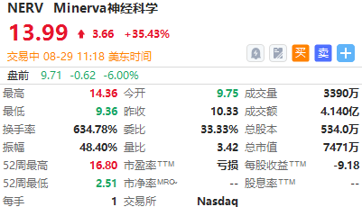 Minerva神经科学 $NERV 盘中涨超35%,现报13.99美元。公司是一家临床阶段的生物制药公司,专注于治疗中枢神经系统疾病的候选产品的开发和商业化。