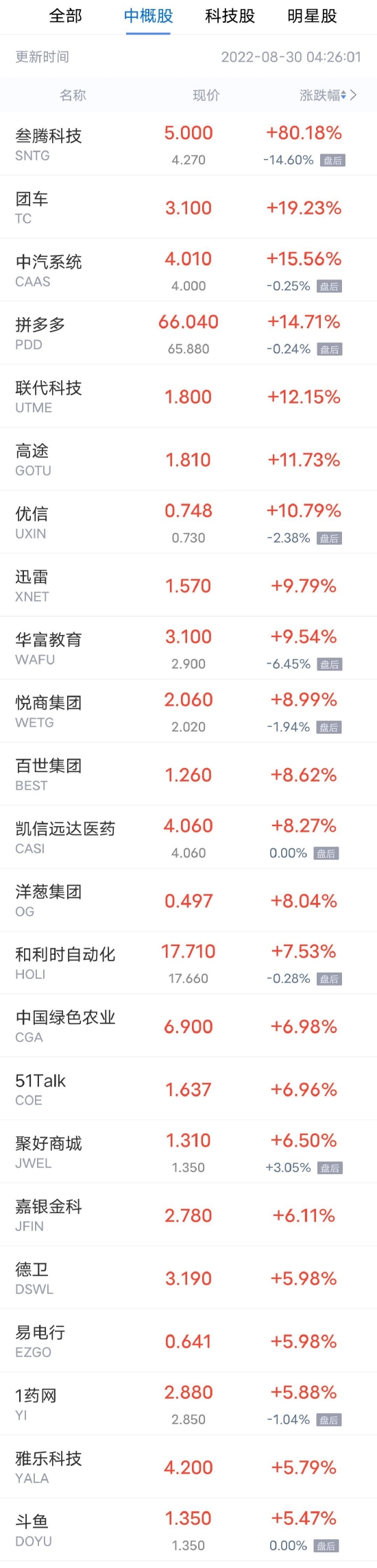 叁腾科技大涨80.18%,团车涨19.23%,中汽系统涨15.56%,拼多多涨14.71%,联代科技涨12.15%,高途涨11.73%,优信涨10.79%,迅雷涨9.79%,好未来涨9.68%,华富教育涨9.54%,悦商集团涨8.99%,凯信远达医药涨8.27%,洋葱集团涨8.04%,和利时自动化涨7.53%,51Talk涨6.96%,中国绿色农业涨6.98%,聚好商城涨6.50%,嘉银金科涨6.11%,德卫涨5.98%,易电行涨5.98%,1药网涨5.88%,雅乐科技涨5.79%,斗鱼涨5.47%,奥瑞金种业涨5.13%。