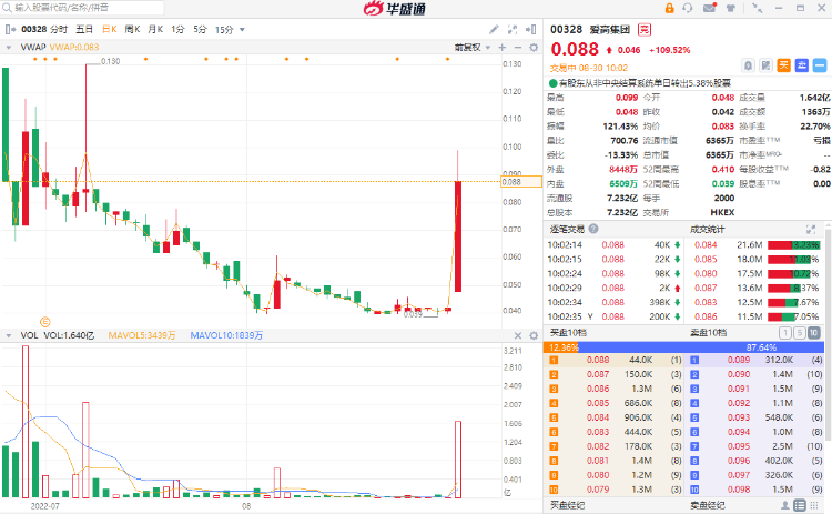 华盛资讯8月30日消息,港股爱高集团盘初急速拉升,升约1.1倍。公司拟按每股0.1港元配售最多约已发行股本10%,配售价溢价约138.10%,净筹约697.93万港元。截至发稿,爱高集团涨109.52%,报0.088港元,成交额0.13亿港元,市值为0.63亿港元。