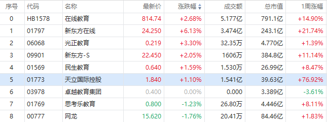 华盛资讯8月30日消息,港股教育股早盘再度大涨,截至发稿,新东方在线超6%,连续8个交易日上涨。天立教育拉升涨超3%,早盘一度跌超10%;新东方-S现涨超2%,光正教育、民生教育跟涨。