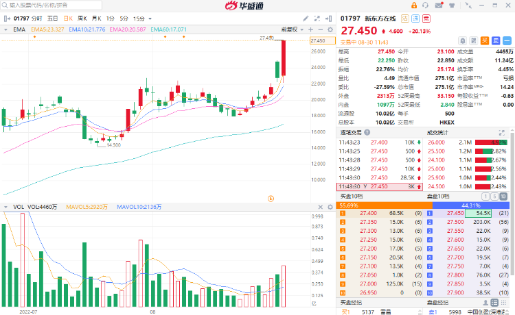 华盛资讯8月30日消息,新东方在线涨幅继续扩大,一度大涨20%创两个半月来新高,截至发稿涨20.13%,成交11亿港元,市值达275亿港元。