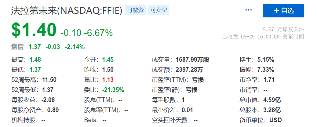 截至发稿,法拉第未来在美股股价下跌超过6%,报1.4美元一股,总市值为4.59亿美元左右。
