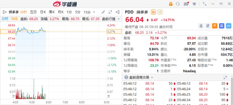 8月30日,拼多多盘前继续走高,涨超3%,隔夜大涨近15%,报68.20美元每股。周一盘前,拼多多公布Q2季度报告,总营收为314.4亿元,同比增长36%。归属于拼多多普通股股东的净利润为88.963亿元,上年同期为24.146亿元,同比增长268%。
