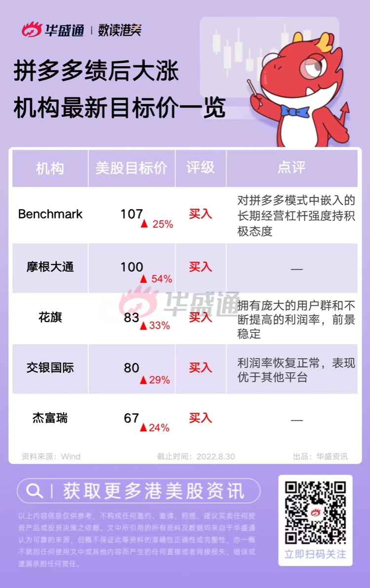 Benchmark 对拼多多的目标价从 85 美元上调至 107 美元,并在该公司发布Q2季度报告后维持对该股的买入评级。该行将拼多多Q2季度的优异表现归因于在快速变化的宏观环境中的强大执行力,农业重点有助于捕捉锁定期间消费者对日常必需品不断增长的需求,以及随着消费者交易量下降而物有所值产品的弹性。虽然“一些因素在本质上是短期的”,但该行对拼多多模式中嵌入的长期经营杠杆强度持积极态度,并在季度报告后上调了22财年和23财年的预测。