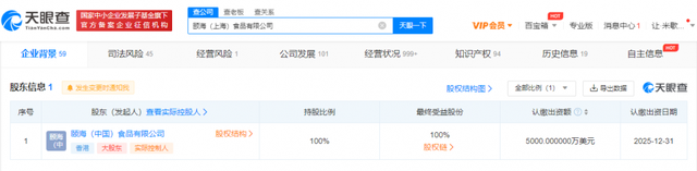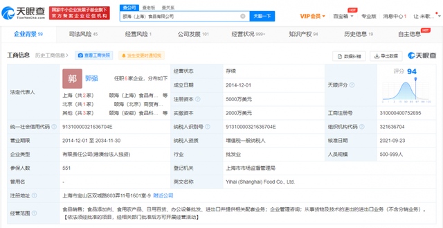 天眼查App显示,颐海(上海)食品有限公司成立于2014年12月,法定代表人为郭强,注册资本5000万美元,经营范围包括食品销售;食品添加剂、食用农产品、日用百货、办公设备批发、进出口并提供相关配套业务等。股东信息显示,该公司由颐海(中国)食品有限公司全资持股。对外投资显示,该公司投资了分布于全国多地的颐海食品公司。