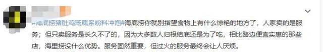 对此,有网友称:“本想养生竟全是添加剂”“大家都知道肯定不可能自己煮的,但是价格就别那么贵啊”“一个锅底近50,结果还搞植脂末”“这说不过去吧,锅底那么贵”“又贵又廉价”“我怀孕的时候还特地去吃过这个,以为很干净健康”“海底捞你就别指望食物上有什么惊艳的地方了,人家卖的是服务;但只卖服务是长久不了的,因为大多数人归根结底还是为了吃,相比路边便宜实惠的那些店,海底捞没什么优势”。