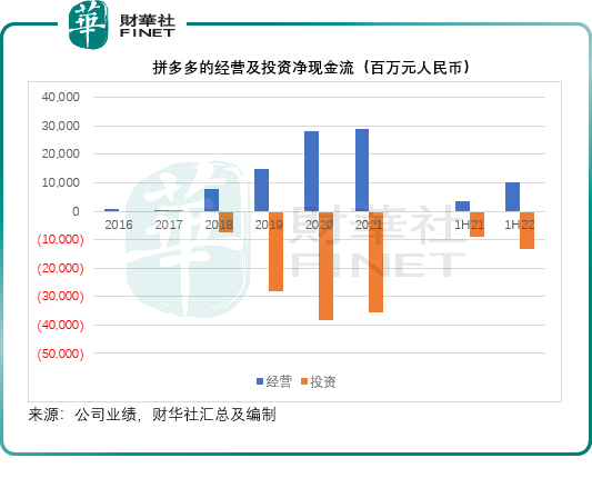 综合2022年前两个季度,拼多多上半年来自经营活动的净现金流入同比增长182.6%,至103.06亿元,但是有134.45亿元的净现金流出用于投资活动,超过经营活动的净现金流入。