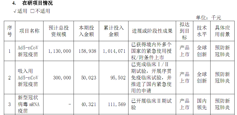 其中,Ad5-nCoV累计投入10.14亿元,预计总投入11.3亿元,已获得境内外多个国家的紧急使用授权或附条件上市。