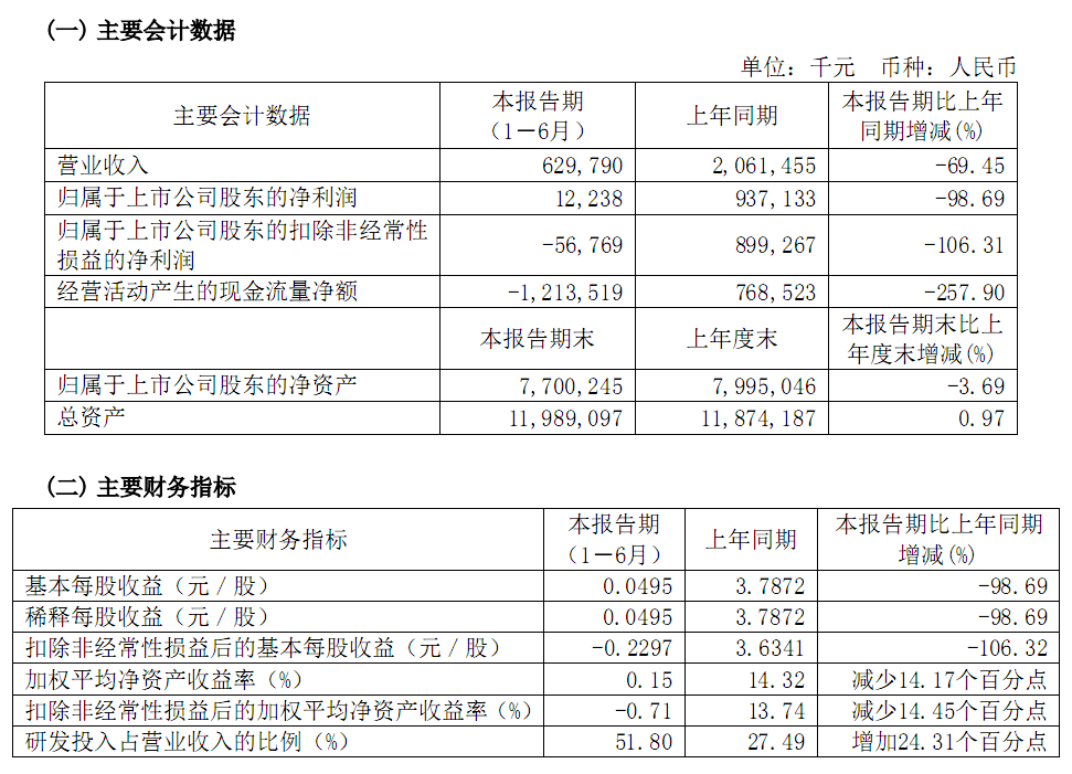 根据最新财报,康希诺公司2022年上半年营业收入6.3亿元,同比下降69.45%;归母净利润1223.8万元,同比下降98.69%;扣非净利润亏损5676.9万元,由盈转亏;基本每股收益0.0495元,同比减少98.69%。