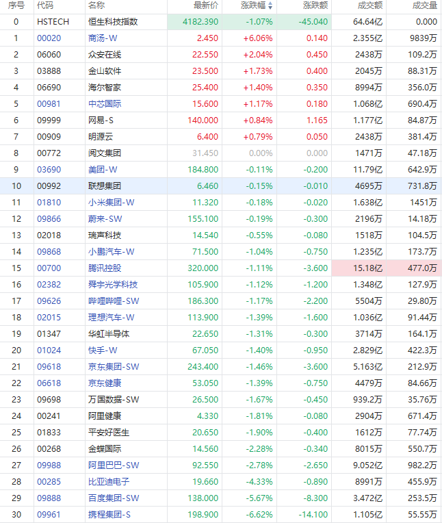 商汤升逾6%领涨成分股,金山软件、中芯国际涨超1%;科网股早盘再度下行,携程集团-S续跌超6%,百度集团-SW绩后跌超5%,阿里巴巴-SW跌2.68%,快手-W、腾讯控股跌超1%。
