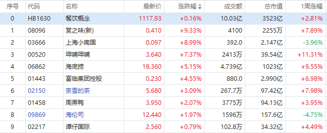 华盛资讯8月31日消息,港股午后拉升走强,恒生指数重回重上两万点关口。餐饮板块多数走强,截至发稿,呷哺呷哺涨7.37%;海底捞涨5.15%;奈雪的茶涨超3%,周黑鸭、海伦司涨2%,谭仔国际跟涨。