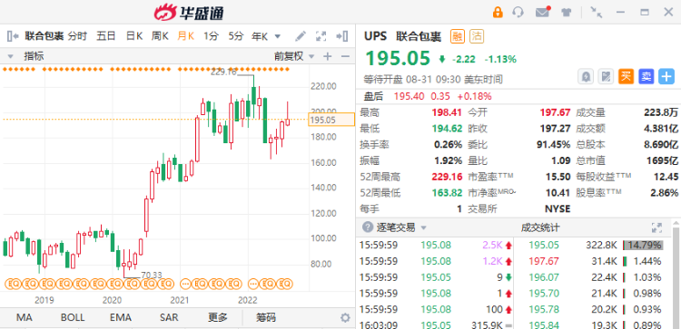 联合包裹同样采用季度支付的方式付息,每年股息收益率约为3.06%,即每股6.08美元。最新季度业绩显示,联合包裹Q2总营收同比增5.7%,同时公司预计2022年经董事会批准后的股息支付额约为52亿美元;计划在2022年提高股票回购规模,使得今年回购达到30亿美元,高于上季度公布的20亿美元目标规模。