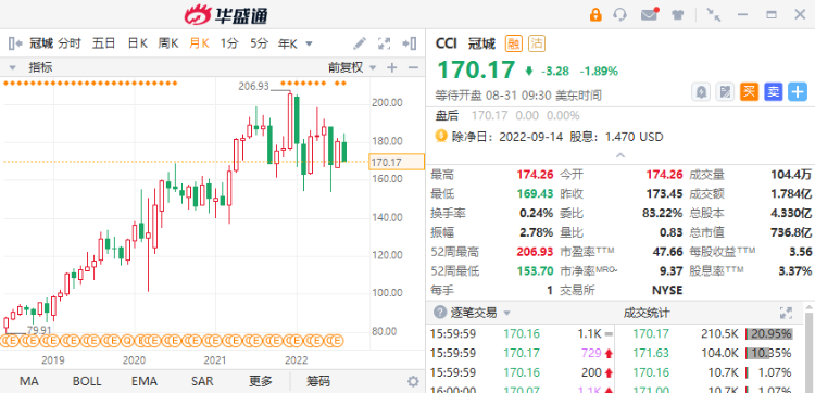 在股神巴菲特和比尔盖茨的持仓中均出现了该股:冠城公司Crown Castle。该公司为无线基础设施运营商,成立于1994年,在美国和澳大利亚从事共享无线基础设施的拥有、运营和租赁。在2020年时,冠城公司首次进入财富500强,位列第496位。该公司年内累计回调约17%,跌幅与标普500指数相当,回报超过纳指。