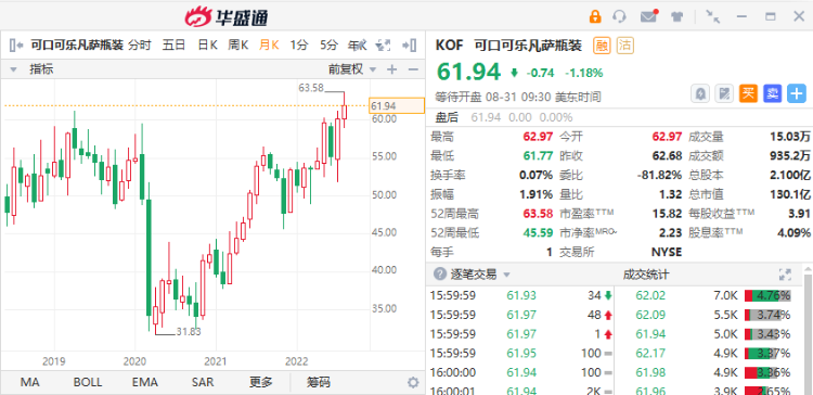可口可乐凡萨瓶装公司的股息收益率为4.12%,即每年2.56美元,支付方式为每半年支付一次,此前有连续3年增加股息的记录。数据显示,受到销量增长和定价提高等因素的推动,该公司Q2总收入增长19.9%。