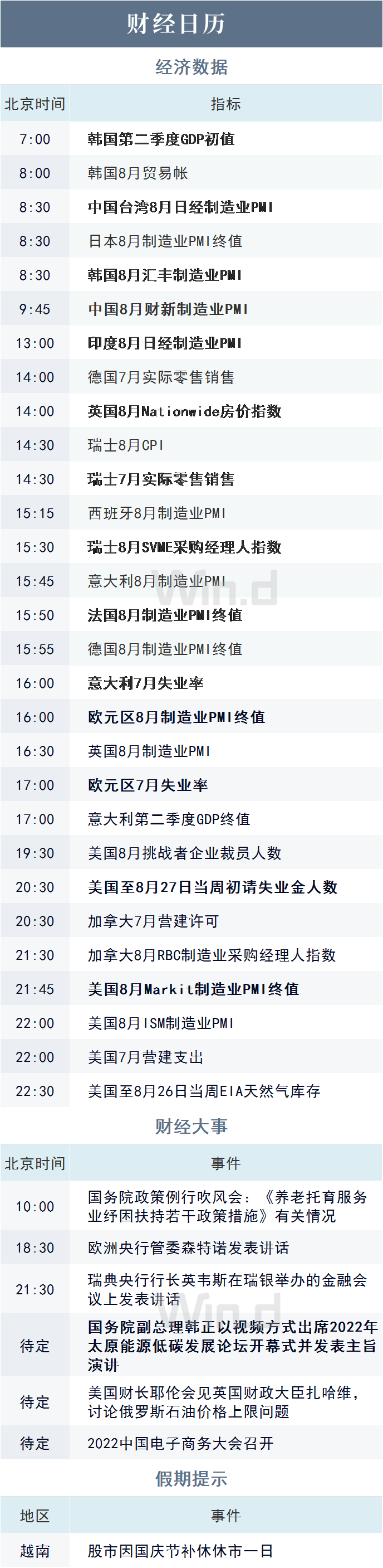 隔夜油价盘中跌近4%,美油失守90美元,油价连跌三个月;美国白宫8月31日称,七国集团财长会将于9月2日召开,美国财长耶伦和英国财政大臣扎哈维讨论了对俄罗斯石油实施价格上限的计划,以降低全球能源价格并限制俄罗斯的收入。